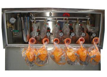 組成:礦用壓風自救裝置包括箱體,箱體上設有壓風接頭,其內設有多組分別與壓風管相連的呼吸器,每組呼吸器的支管上均設有手動進氣閥。